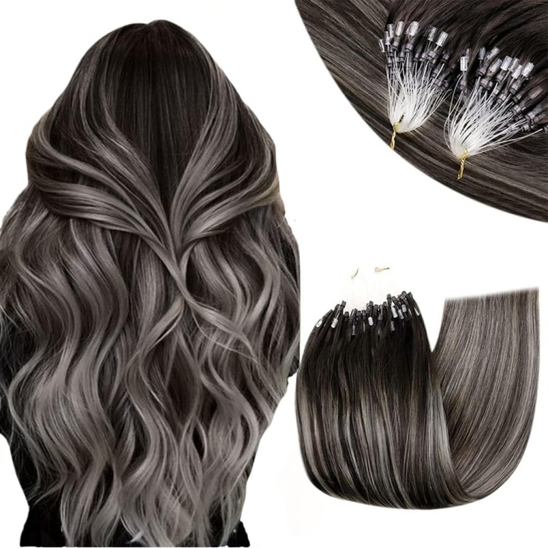 RUNATURE Microlink Hair Extensions Human Hair Ombre Black to Silver Micro Bead Hair Extensions Real Human Hair Pre Bonded Micro Beads Hair Extensions Remy Hair Cold Fusion 14 Inch 50g 50s