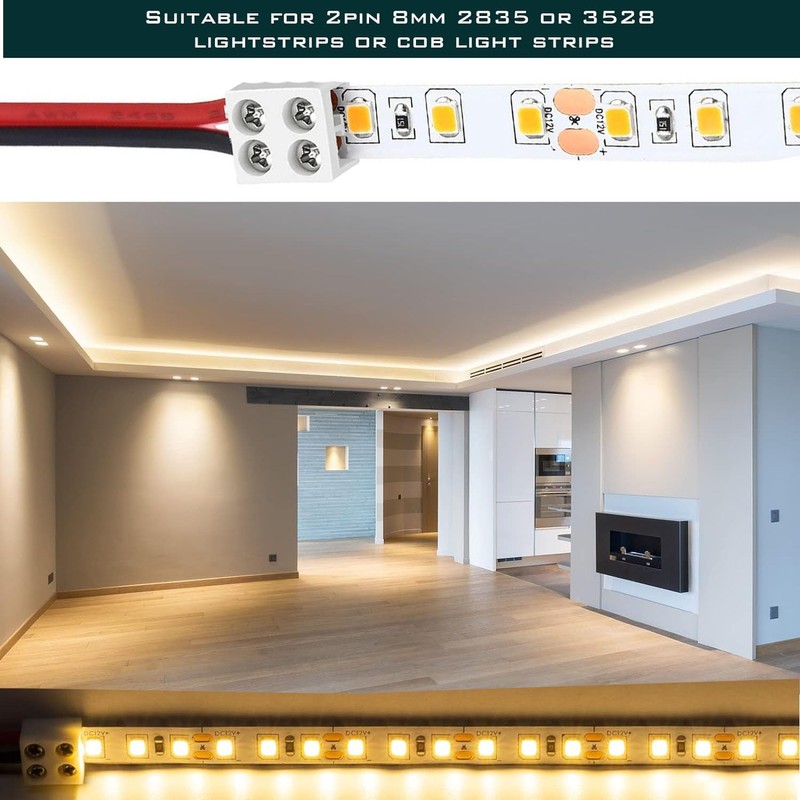 - ✔The 2-pin LED strip connectors feature a unique mechanical design with screw cap for optimal connection of the strips. No tedious soldering required - connecting the LED strip to the cable is quick and easy. The connectors are suitable for waterproof and non-waterproof 2 pin 8 mm LED strips (IP65) as well as COB strips.