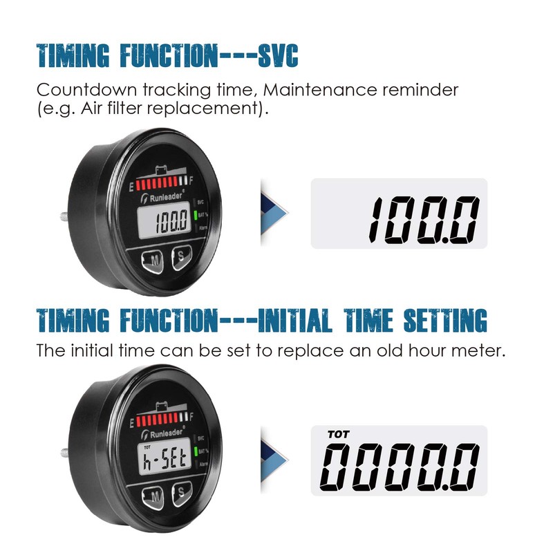 Runleader 12V to 48V Digital LED Battery Capacity Monitor, Hours Volt Meter Gauge - Suitable for Battery Lead-Acid LiFePO4 Trojian Gel AGM,Works on Golf Club Forklift Go Kart RV Trailer Stacker.