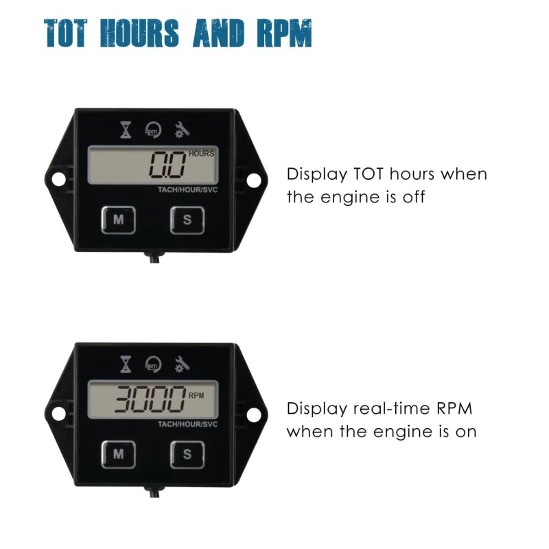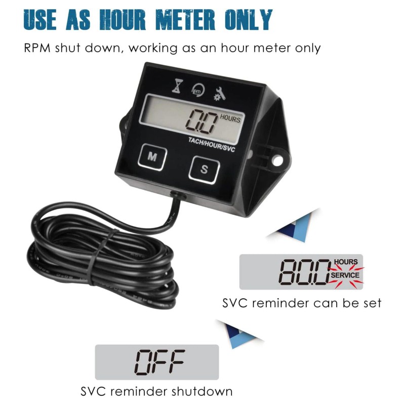 • PACKAGE CONTENTS ---- 2 pieces hour meters, 1 large box containing 2 individually packaged hour meters, solving the need for maintenance of more than one engine.HM001E includes tachometer, hour meter, service timer functions.