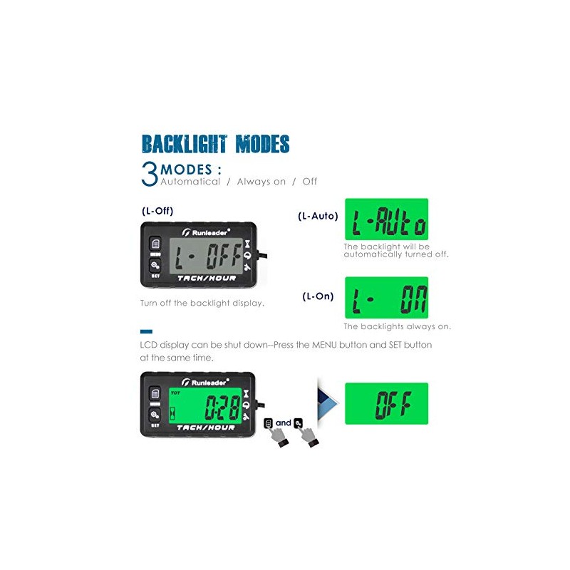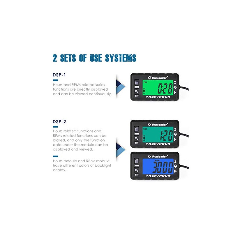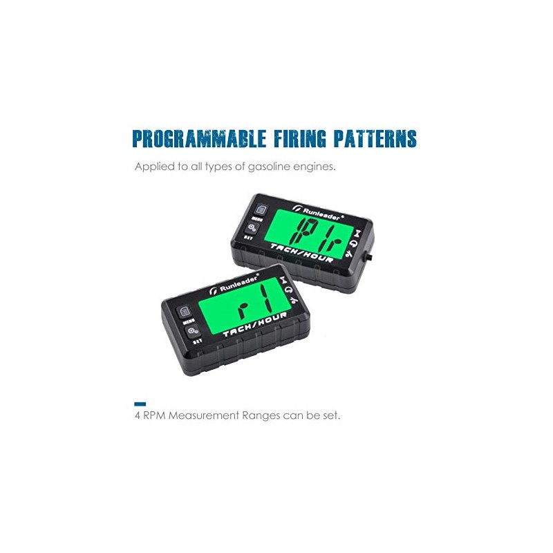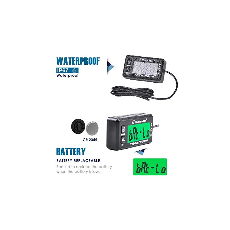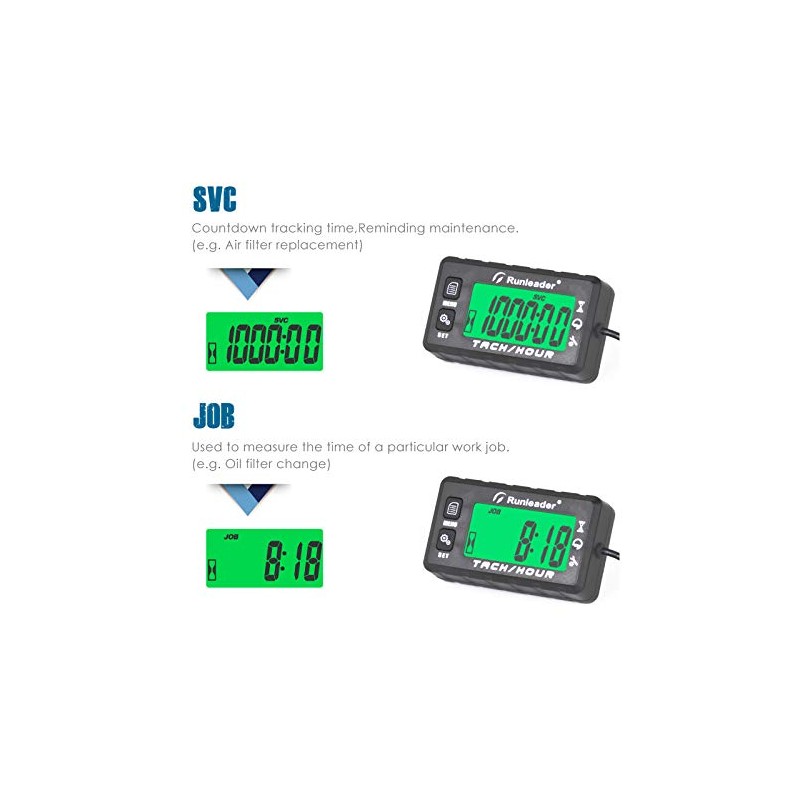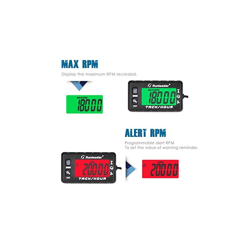 Runleader Operating Hour Counter, Tachometer, Maintenance Hour Counter, Alarm RPM Reminder, Multicoloured Display with Backlight, Adjustable Initial Hours, Waterproof, Black