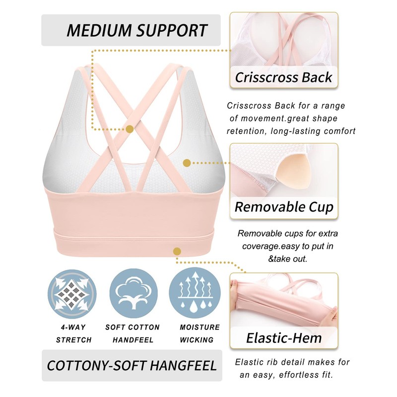 - WHY WE MADE THIS:Need a sports bra that does it all? Look no further! This sweat-wicking cross-strap bra gives you the coverage and support you need for yoga, run, and the gym—without restricting your movement or breath. fabric has added lycra that allows the bra to stretch with you and retain its shape over time. Slip in optional, removable cups for full coverage—if you want it. This bra is intended to provide medium support for great shape retention, long-lasting comfort.