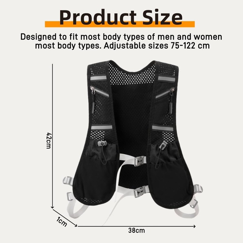 - Easy to use: the running vest is ergonomically designed and has adjustable waist and chest straps to effectively distribute weight and reduce energy consumption. The close-fitting design and non-slip properties prevent the vest from slipping or popping up during exercise, and it is suitable for people with a chest circumference of 78-110 cm.