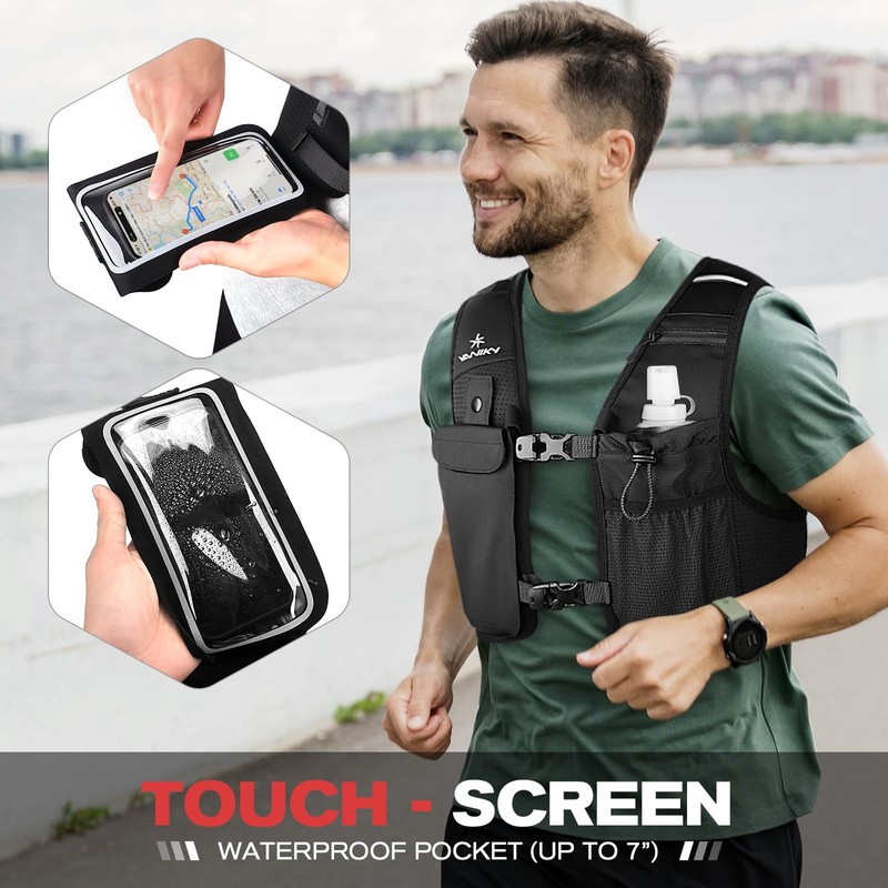 - Versatile Storage Options:This hydration vest features zippered and mesh pockets to store your energy gels, snacks, keys, towel, and other essentials. The transparent, touchscreen-friendly, and waterproof phone pocket lets you take calls and reply to messages without removing your phone. Plus, its spacious back zippered compartment fits up to a 2-liter hydration bladder, keeping you hydrated during long activities.