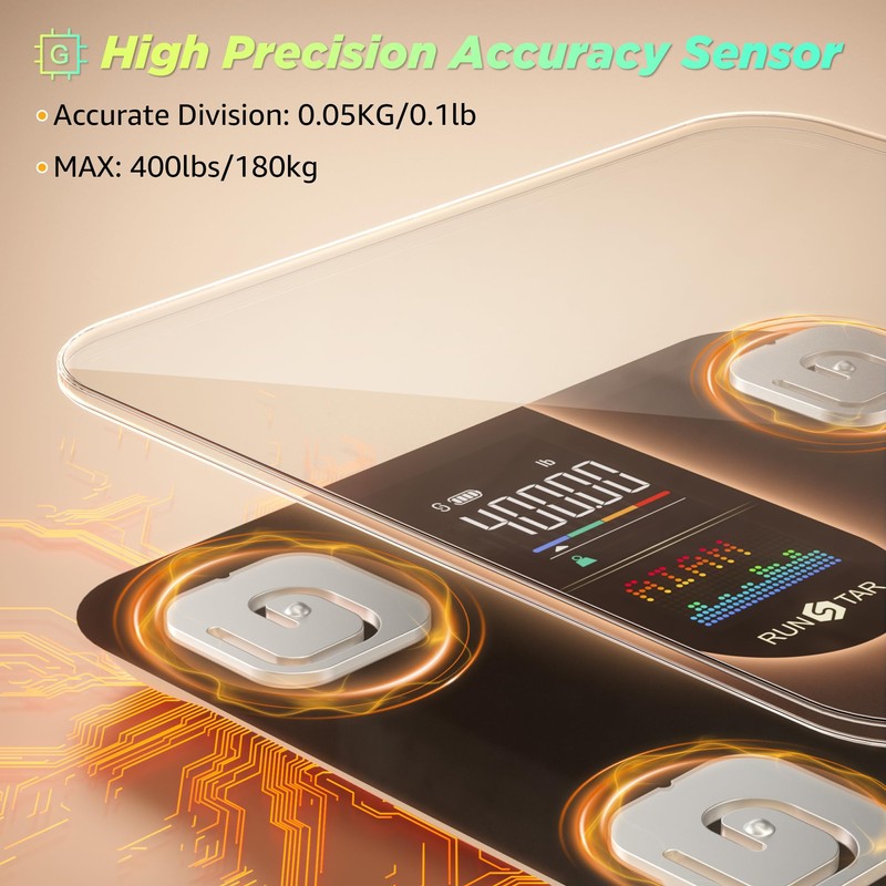 - High Precision & Accuracy: The Runstar scale for body weight upgrades sensitive electrodes that can auto-identify and match user profiles, only takes 20 seconds to measure your 22 body detail indicators. Upgraded high-precision sensor performance has been tested over 100,000 times—ensuring high accuracy weighting to 0.1lb/ 0.05kg, supporting up to 400lb/ 180kg