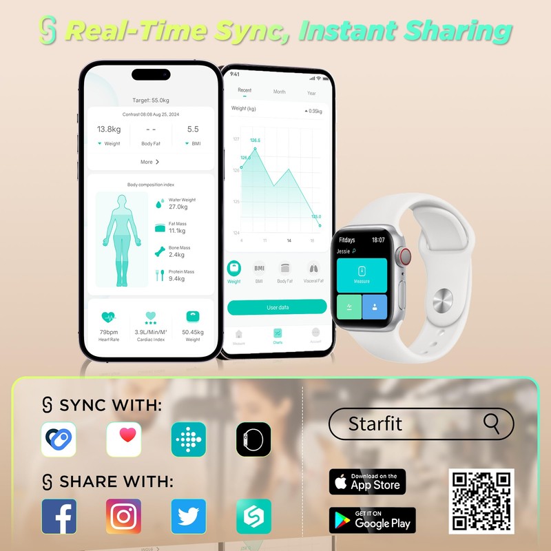 - Good Assistant for Weight Loss: Easily sync the smart scale with Apple Health, Fitbit, Starfit and Health Connect, and share your progress on Instagram, Facebook, or Twitter. Download the Starfit APP from the APP Store before weighting, to seamlessly track your body composition metrics over days, weeks, months, and years—visualize your progress and adjust your fitness or diet plan accordingly