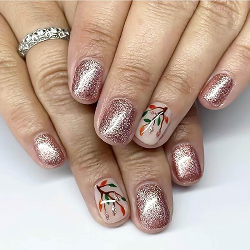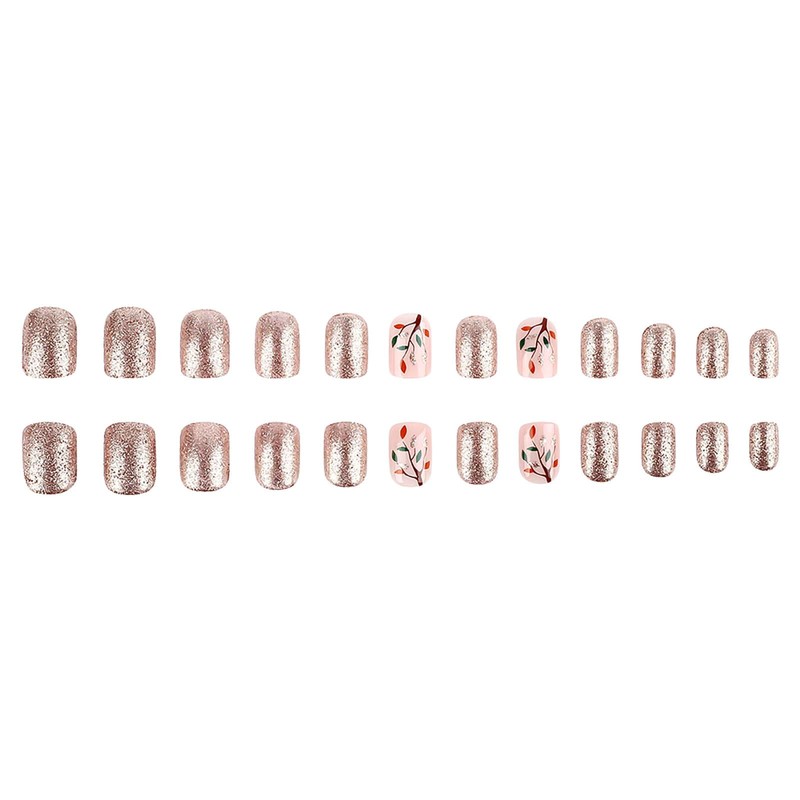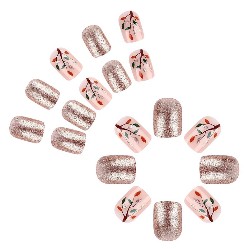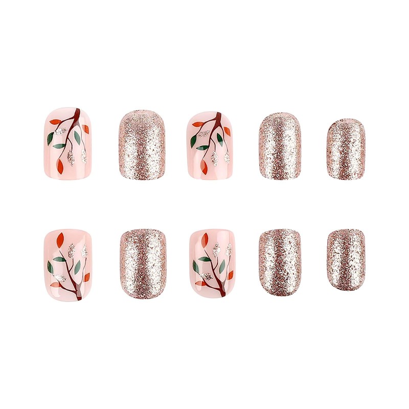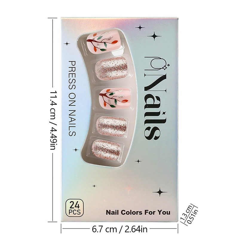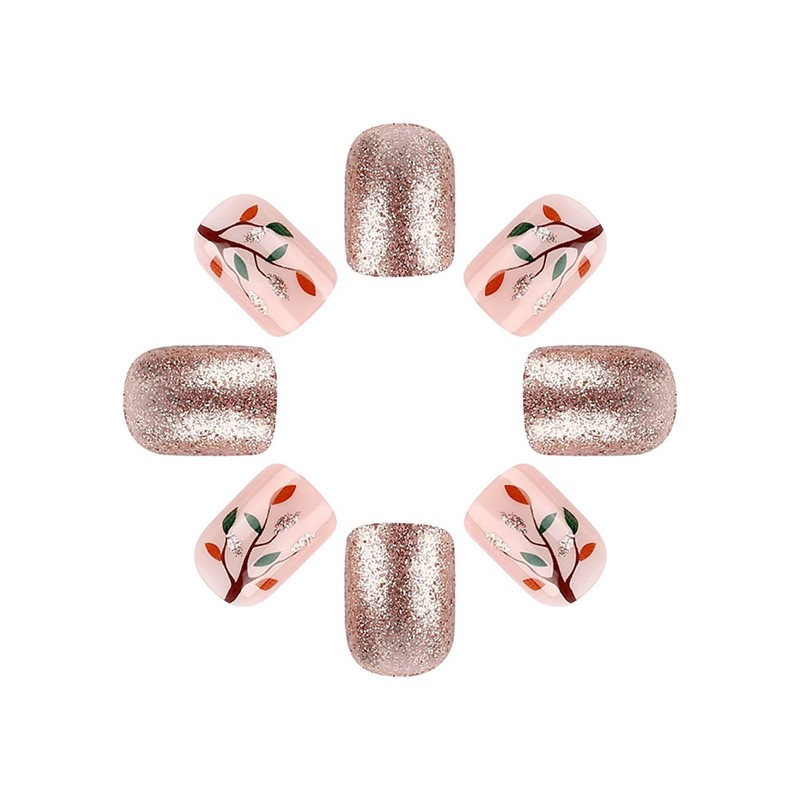 RUOKEXIN Fall Press-on Nails - Short, Square, Pink False Nails with Glitter Designs - 24 Pcs