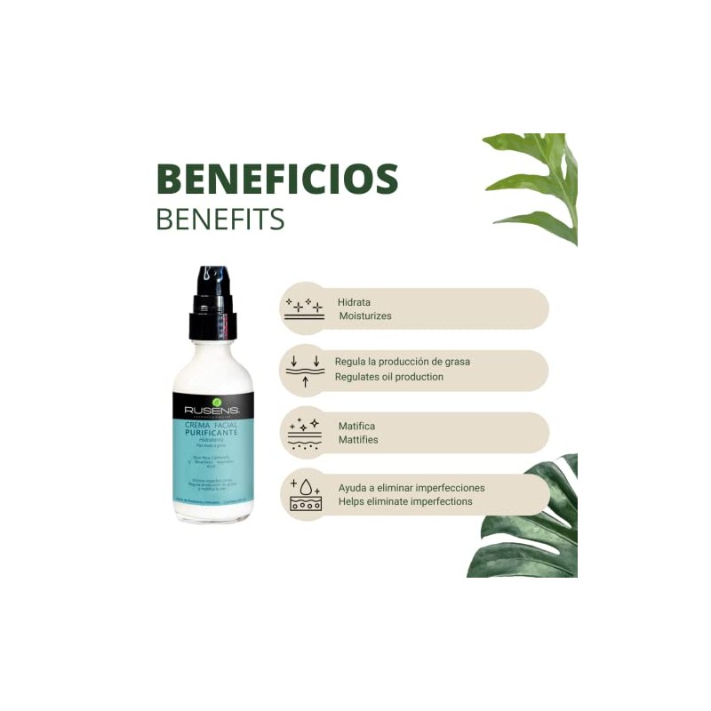 Rusens - Crema Facial Purificante, Matificante (Antiacné) 99% Natural, Ideal para Piel Grasa a Mixta con Tendencia a Acné, - Consistencia Ligera y de Rápida Absorción- Regula Producción de Grasa, Controla Barritos y Espinillas, Hidrata la piel.