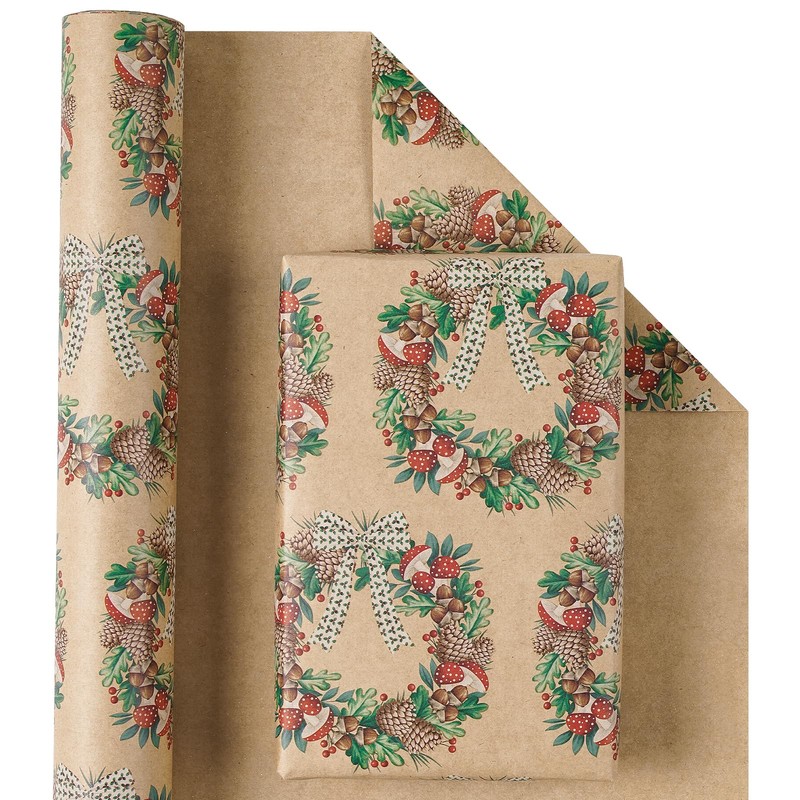 RUSPEPA Kraft Christmas Wrapping Paper Roll, Mini Roll, Wreath Design with Pinecone, Berry & Polka Dot Bow, Kraft Gift Wrap for Kids, Women, Holiday, Winter Party, Rustic Theme, 17 Inches x 16.4 Feet