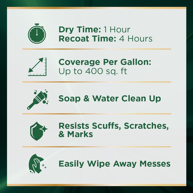 • SUPERIOR COVERAGE & FAST DRYING: One gallon covers up to 400 sq. ft. and dries to the touch in 1 hour