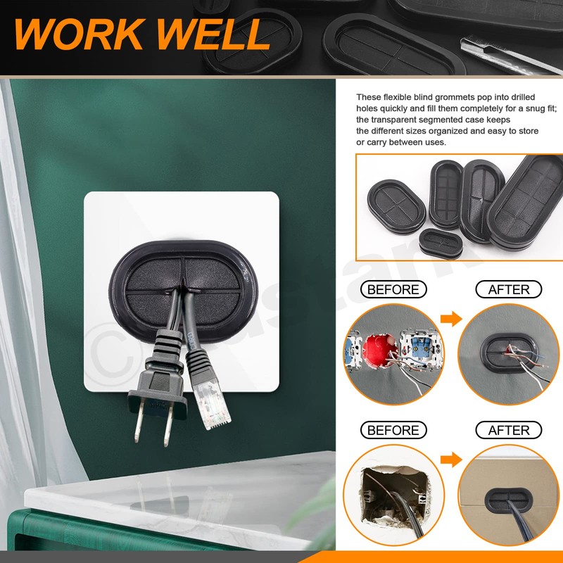 • 3.▲【Easy to Use】 --- Just use the included retractable knife to cut out the right hole for the grommet, thread the wire through, and snap the grommet onto the place. Double Sided closed grommets can support and stabilize wires better than open grommets, protecting cables/wires/lines/cords from sharp corners and edges.