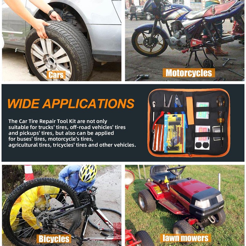 - 【 Wide Application 】 ----- Our complete tire repair kit is a great solution for a wide range of vehicles, such as cars, motorcycles, tractors, trucks, trailers and more. Besides, our tire repair patches kit suitable for novice or expert, you can confidently handle unexpected tire issues with these reliable tools.
