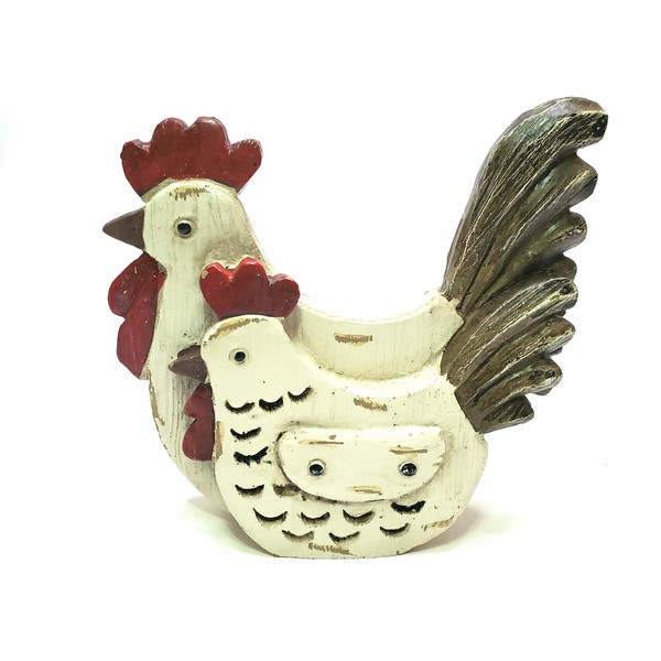 5 inches by 5 inches by 1.5 inches rustic chicken pair figurine add a touch of country farmhouse to your interior. Made of durable resin this sweet pair is ready to decorate your tabletop or shelf or gift to that person who is all about country living.