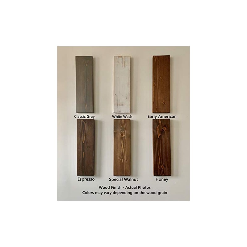 These shelves are available in Golden Oak, Dark Walnut, Special Walnut, and Espresso colors. Each piece is handcrafted, sanded and coated with Minwax Stain.