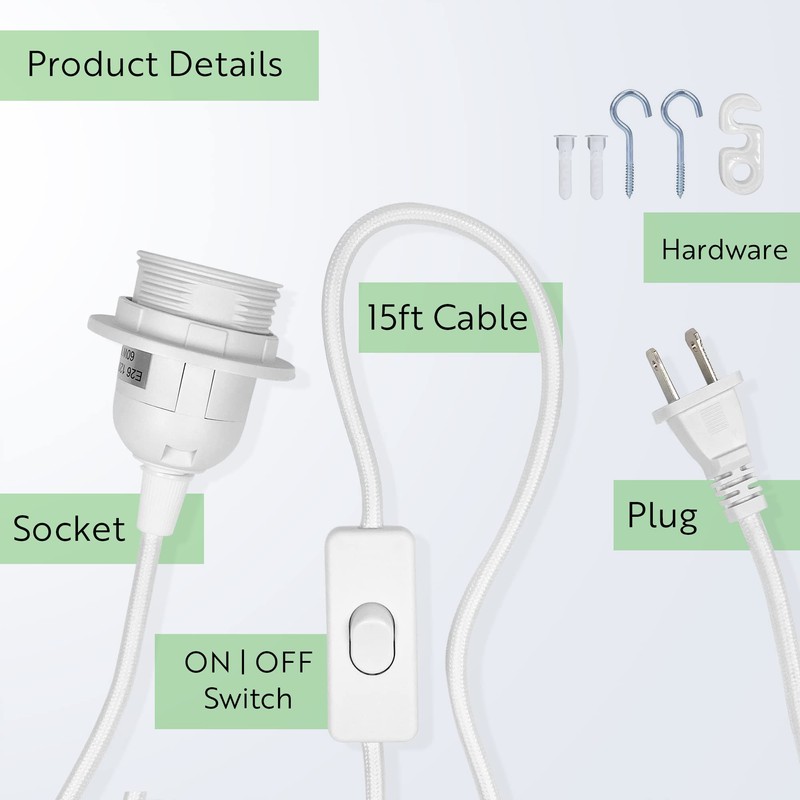 - Easy to Install and Use: This 15 feet long lamp cord with ON/OFF Toggle Switch comes with all the necessary mounting accessories including hooks and ceiling mounting clips for your convenience. Just simply mount it on the ceiling, insert a E-26/ E-27 light bulb, plug the cord in and enjoy your lighting. You can easily control your light with its ON/OFF Toggle Switch. Please note that this cord is suitable for only E-26/ E-27 Edison light bulb and the bulb is not included in the package.