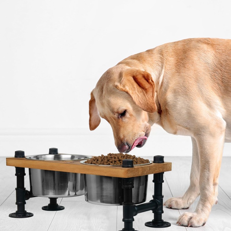 - Exquisite and durable: the paw pattern makes it even more outstanding. The large iron plate at the bottom makes the bowl stable and not easy to slide, and also eliminates the impact sound. raised dog bowls with matte industrial metal pipe and vintage wood finish