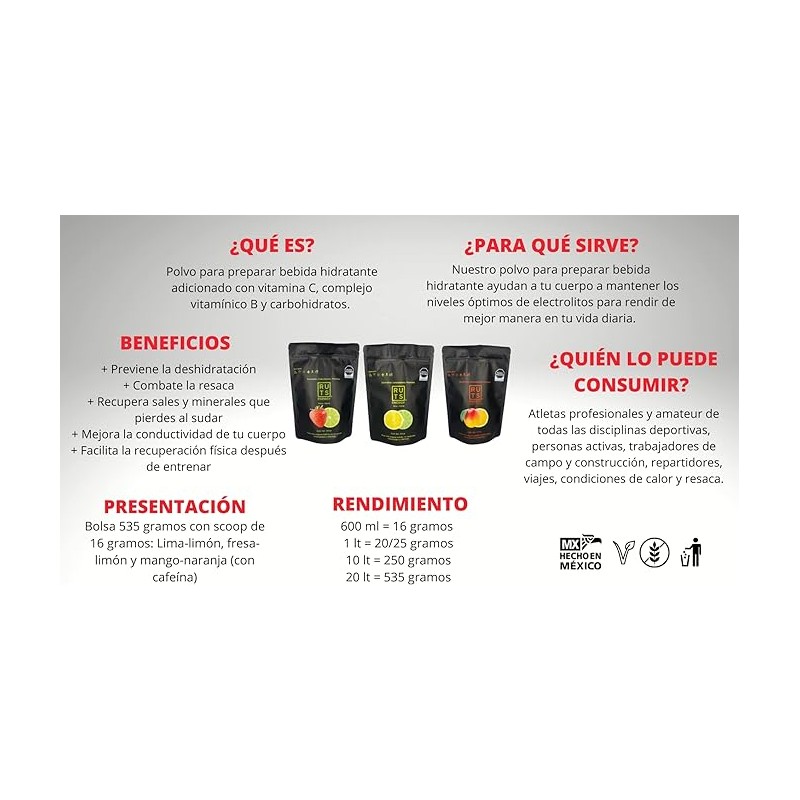 | Ingredientes | ELECTROLITOS, COMPLEJO VITAMINICO B, CARBOHIDRATOS |