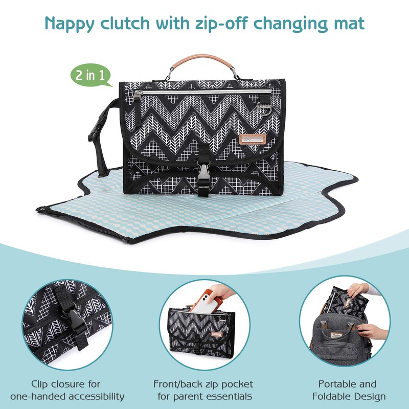 - Very practical design - The portable changing mat folds into a clutch design, making it compact enough for both your handbag and your changing bag. Drop it into any bag, either attach it to your wrist or attach it comfortably to your stroller.