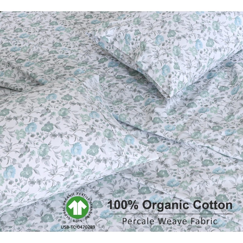 Transform your sleep experience with the RUVANTI 100% Organic Cotton Queen Sheet Set. Made from GOTS-certified organic cotton and OEKO-TEX Made in Green certified, this 4-piece set includes a flat sheet, fitted sheet, and two pillowcases with a 16" deep pocket, ensuring a snug fit on thicker mattresses. The crisp percale weave provides a smooth, breathable feel, while the peach finish adds extra softness, perfect for hot sleepers. Durable and easy to care for, these sheets get softer with each wash. The Floral design adds a refreshing, nature-inspired touch to your bedroom decor. Machine washable for effortless maintenance, they’re perfect for any modern home looking for comfort, style, and sustainability. Experience ultimate comfort with RUVANTI bedding, designed to last and enhance your sleep every night. Sleep Clean , Sleep Cool , Sleep Comfortable with Ruvanti.