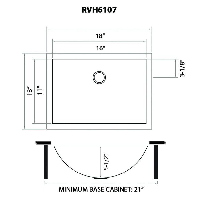 - Exterior Dimensions: 18″ (wide) x 13″ (front-to-back), Interior bowl dimensions: 16″ (wide) x 11″ (front-to-back) x 5-1/2″ (bowl-depth) | Minimum Base Cabinet Size: 21" | Standard 1.75″ drain opening.