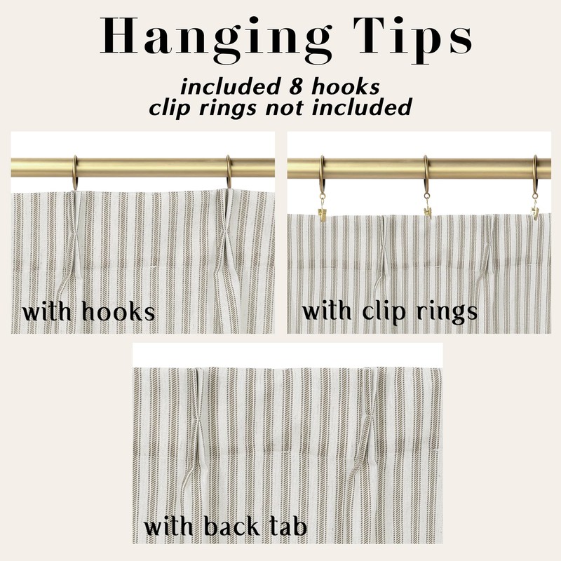 - Method 1 - With hooks in the pack,simply pin the hooks onto back of curtain as the image shows and pin the other end onto your own curtain rings. Method 2 - If you prefer hiding the tension rod,back tab hanging. Method 3 - With your own ring clips for a more casual style.