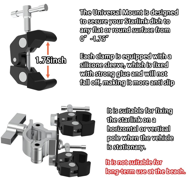 - Applicable Scene: The Starlink Mount is designed to secure your Starlink dish to any flat or round surface from 0”-1.75”. For example on RV ladders, on SUV roof racks, on camper roof rail.
