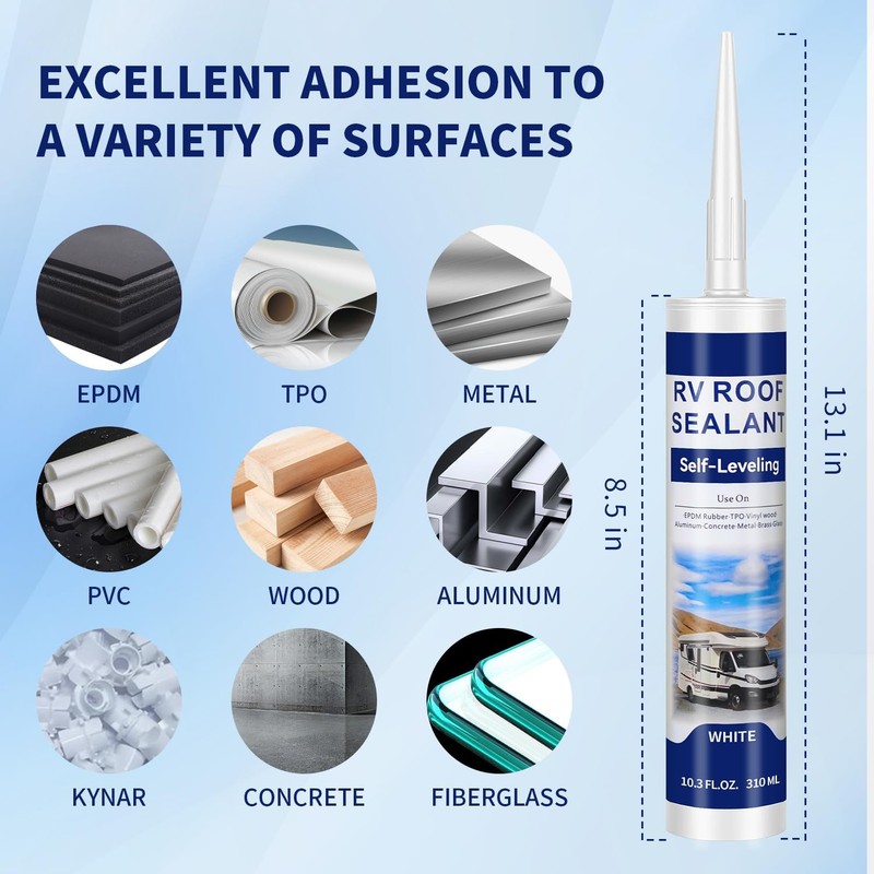 - 【EXCELLENT ADHESION】:Self leveling rv roof sealant Intimate bonding with many substrates, including aluminum, brass, steel, glass, mortar, wood, PVC, EPDM, TPO, TPV, windows, etc. With excellent weather resistance and sealing performance.