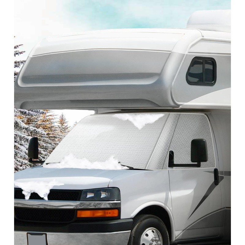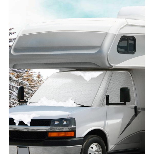 VANNCAMP RV Windshield Cover for Chevy Motorhome 2001-2020, Thick Oxford Front Window Sunshade, Class C RV Windshield Cover for Ice & Snow, Gray with Mirror Cutouts