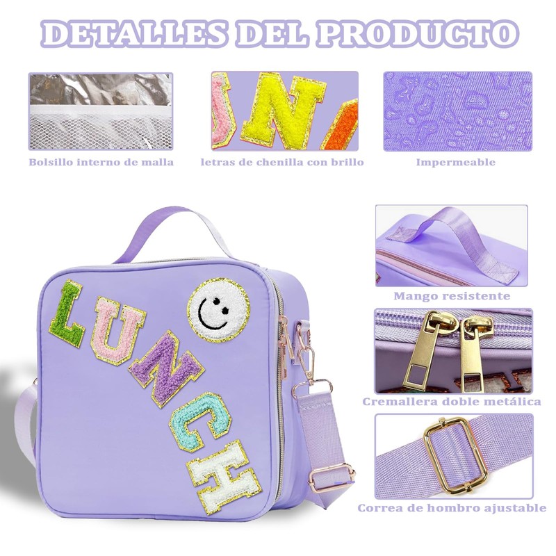 - Linda y a la moda: almuerzo aislada está hecha de material de nailon suave de alta calidad, equipada con coloridos parches de letras de chenilla cosidos profesionalmente y divertidos patrones de caras sonrientes, lo que le brinda energía y buen humor todos los días, correas de hombro y mano ajustables extraíbles. Las asas te permiten cambiar tu atuendo a voluntad, haciéndote más bella.