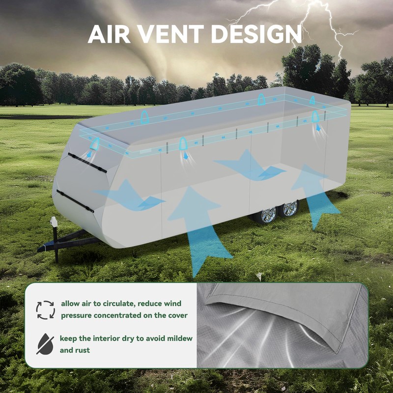 - WIND PROTECTION: Designed with reinforced straps, and high-quality, wind-resistant materials to ensure a secure and tight fit. These features help protect your RV from strong gusts and prevent the cover from lifting or tearing, giving you peace of mind even during stormy conditions.