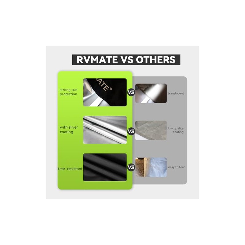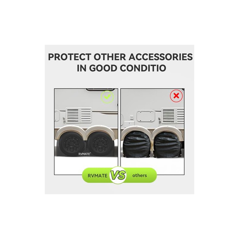 - Función: la funda para neumáticos RVMATE de doble rueda está hecha de tela Oxford 420D resistente con revestimiento plateado que es impermeable, resistente a los rayos UV y proporciona un fuerte sombreado. Esto protege tus neumáticos de la luz solar, la nieve, el óxido y la suciedad, asegurando que permanezcan en buenas condiciones incluso en condiciones climáticas adversas.