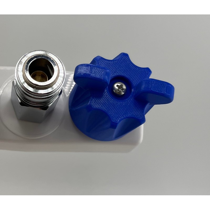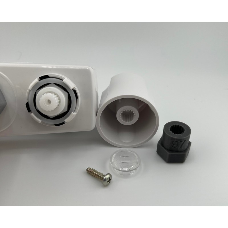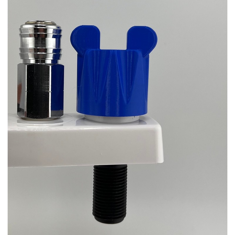 Transform your RV's exterior shower experience with these innovative ergonomic tap handles. Designed to replace standard recessed handles, these user-friendly controls feature distinctive 'mouse ear' ends that make operation smooth and intuitive, especially with wet hands. Perfect for accessing those hard-to-reach shower controls typically hidden in deep pockets behind small doors on your RV's exterior. The universal design fits multiple brands including Valtera, Dura Faucet, Rec Pro, Empire, and other models with quick-connect hoses between tap handles. Each set includes two colored knobs and adapters that mount to various shaft types, including D-shafts and splined shafts. Made in USA.