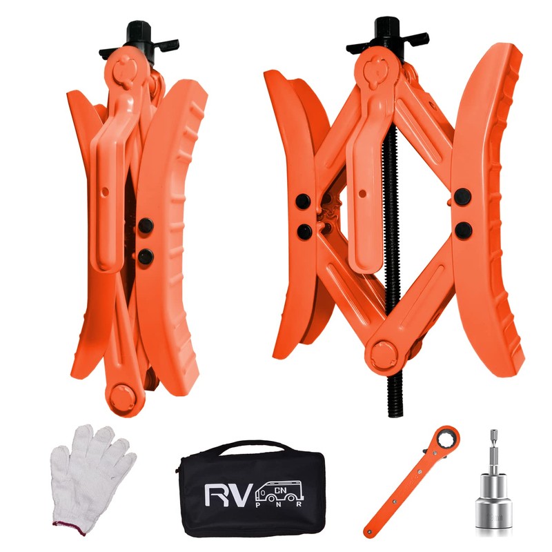 - CARRYING& STORAGE: Packed in storage bag, included 2 chock stabilizer, 1 ratchet wrench, 1 hex socket and gloves.