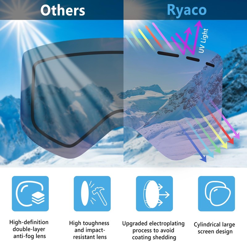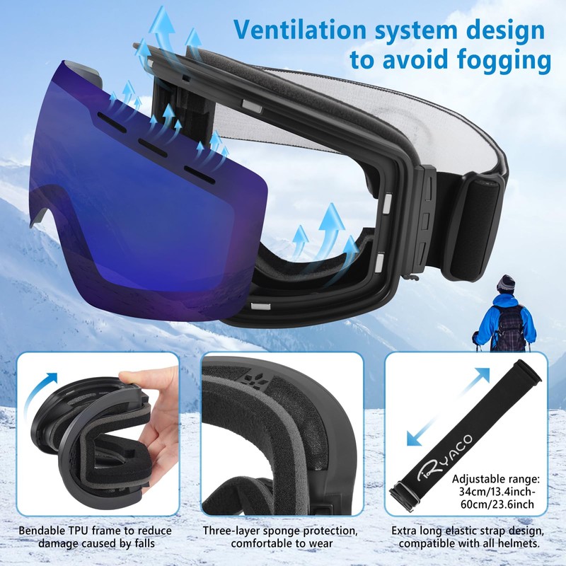 Ryaco Magnetic Lens Ski Goggles Snowboard Goggles, Replaceable Double-layer High-definition Lens, Anti Fog OTG, UV Protection, Snow Sports Goggles for Men, Women, Youth, Adult, Blue