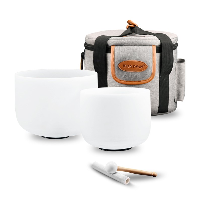 Ryan Dvan Crystal Singing Bowl Set of 2 6" C Note, 8" A Note with Case Suede Striker & O-Ring Sound Therapy for Yoga, Reiki, Chakra Healing Energy Tuning & Mindfulness Kit