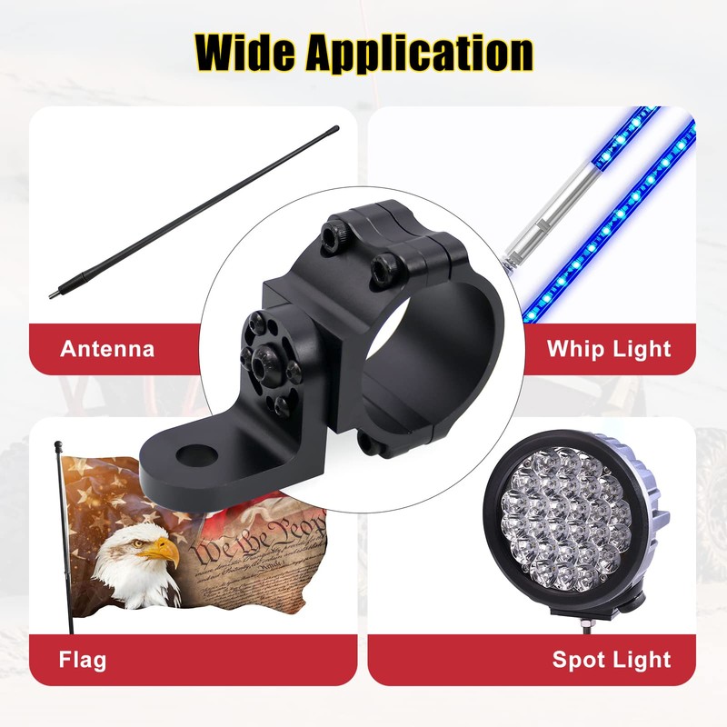 - Multi-usage: This mounting bracket can not only mount the flag on it, but also can mount the whip light, antenna, spot light, light bar on it. It is very useful for most drivers.UTV Flag mount can work well with all road conditions and weather conditions for long-term using.