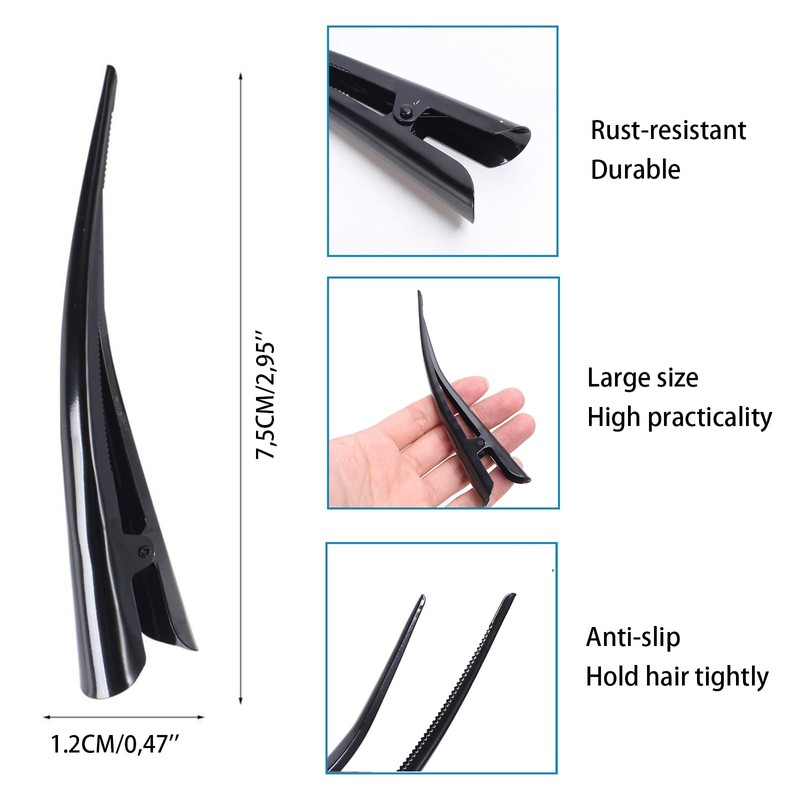 This is a set of 3 pieces duckbill hair clips, which are helpful for curling and holding curls. Simple and useful hair clips for home or professional use. Duck mouth with tooth type closure, can hold long hair with comfort and without damage. Ideal for hair bows, craft projects, organizing office paper documents and more.