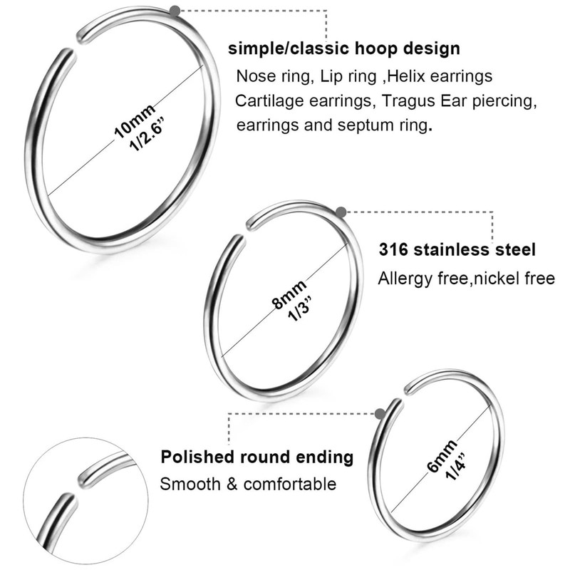 - Nose ring size: these rings have a 3 diameter, 6 mm / 0.24 inches, 8 mm / 0.31 inches and 10 mm / 0.39 inches. Nose studs are simple and elegant for everyday jewellery, nose ring can be used as earring hoops, nose rings, lip rings, cartilage earrings, septum rings, nose studs, etc.