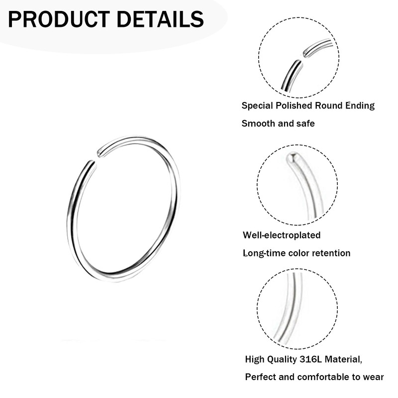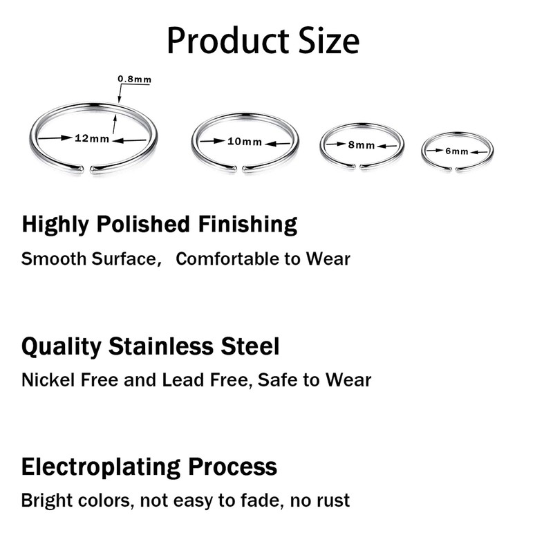- Nose ring size: these rings have a thickness of 20 mm (0.8 mm) and they have 4 diameters, 6 mm / 0.24 inches, 8 mm / 0.31 inches, 10 mm / 0.39 inches and 12 mm / 0.47 inches. You can use them for different purposes.