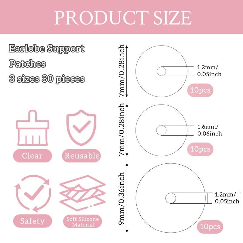 - Versatile Size Options This package includes 30 pieces clear silicone piercing discs in three sizes: 10 pieces with 7mm diameter and hole sizes of 1.2mm and 1.6mm and 10 pieces of 9mm diameter and a hole size of 1.2mm.