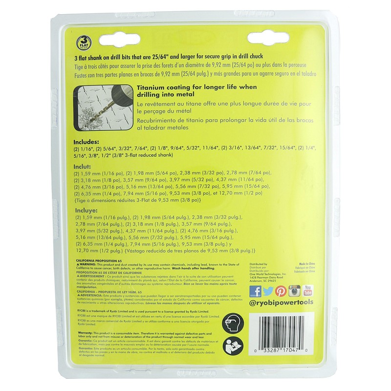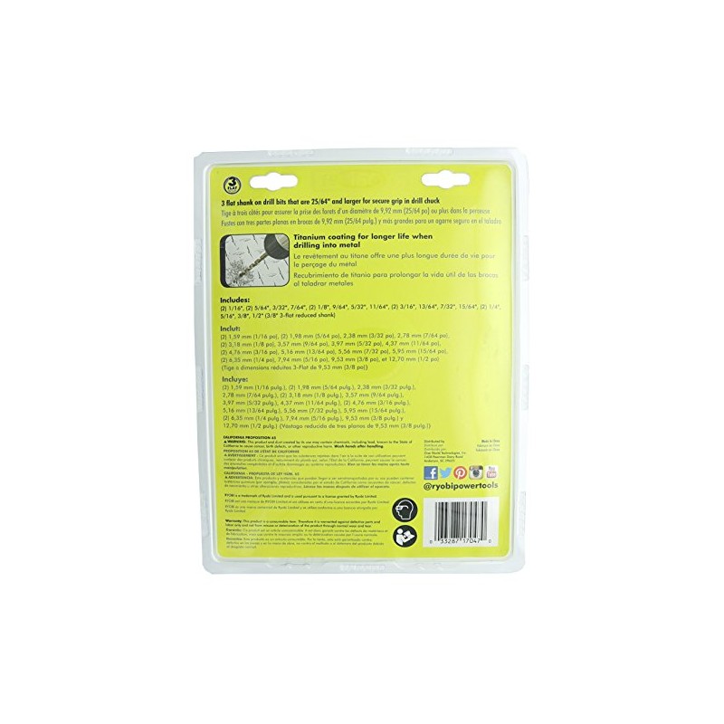 - INCLUDED BITS: 2 x 1/16”, 2 x 5/64”, 1 x 3/32”, 1 x 7/64”, 2 x 1/8", 1 x 9/64”, 1 x 5/32”, 1 x 11/64”, 2 x 3/16”, 1 x 13/64”, 1 x 7/32”, 1 x 15/64”, 2 x 1/4", 1 x 5/16”, 1 x 3/8", and 1 x 1/2"
