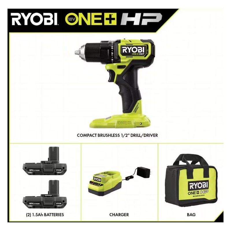 RYOBI ONE+ HP 18V Brushless Cordless Compact 1/2in. Drill/Driver Kit with (2) 1.5 Ah Batteries and Charger