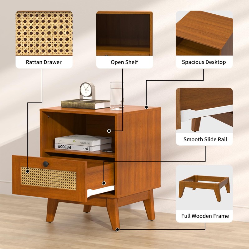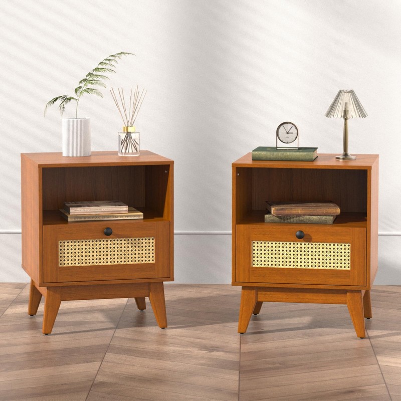 • RATTAN SIDE TABLE- The nightstands are equipped with a rattan drawer and open shelf, which provide more space to put down books, snacks, drinks.