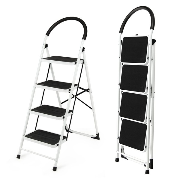 This 4 step stool ladder is a perfect tool when you need a little extra height for reaching items around the house, office or garage. Durable rustproof steel frame is constructed with reliability and strength. With a 330lbs weight capacity, you'll feel safe and comfortable getting to those hard to reach places. The step stool also features large non-slip feet, wide platform that automatically locks in place and a convenient handgrip. These 4 steps make it possible for you to reach things that would have been a hassle before. This practical ladder can be used to decorate, change lamps, decorate festivals, trim branches, pick fruits and more. Folds up thin for easy storage anywhere in your home, garage, office, etc.