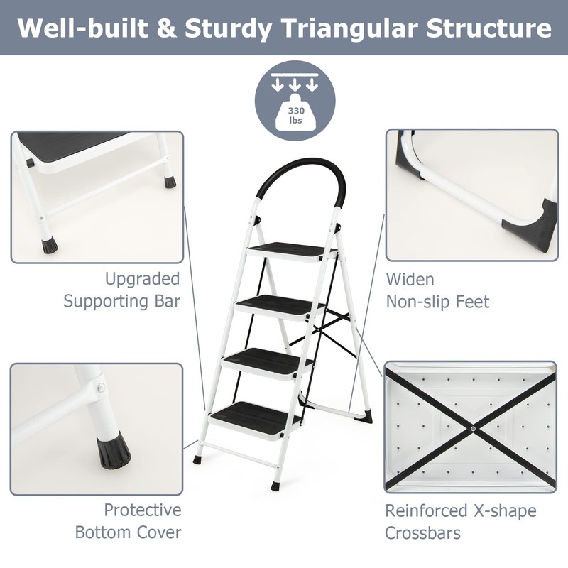 • 🪜【Durable & Sturdy Structure】 Our 4 step ladder is constructed from sturdy steel pipes for excellent stability and durability. The back cross bars, front support bar and side triangular structure all strengthen the stability, preventing from wobbling or deformation. Maximum Load Capacity: 330 lbs. Rustproof finish makes it more durable for long lasting use, also easy to clean.