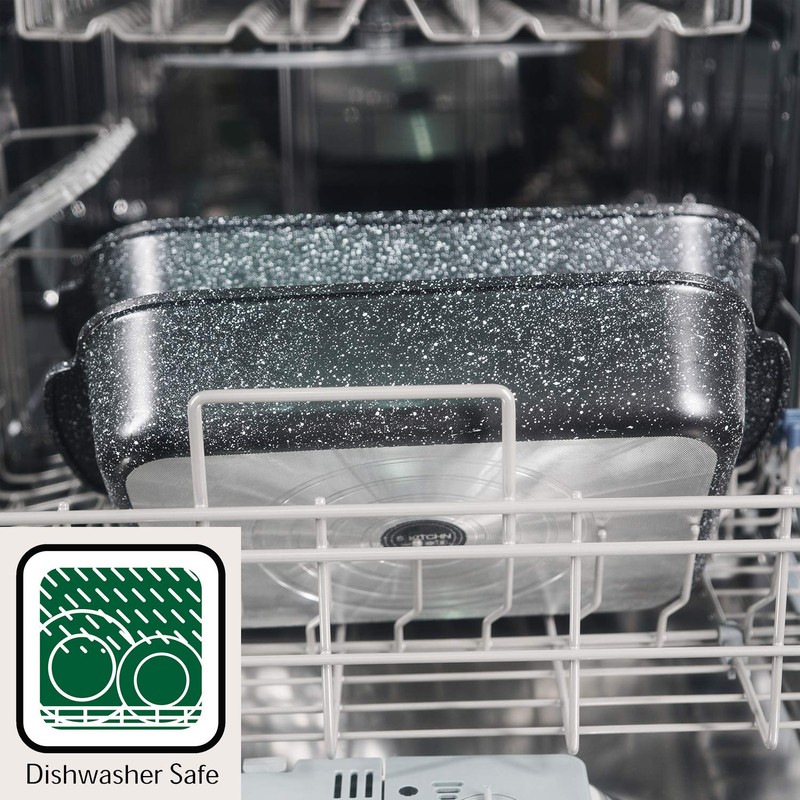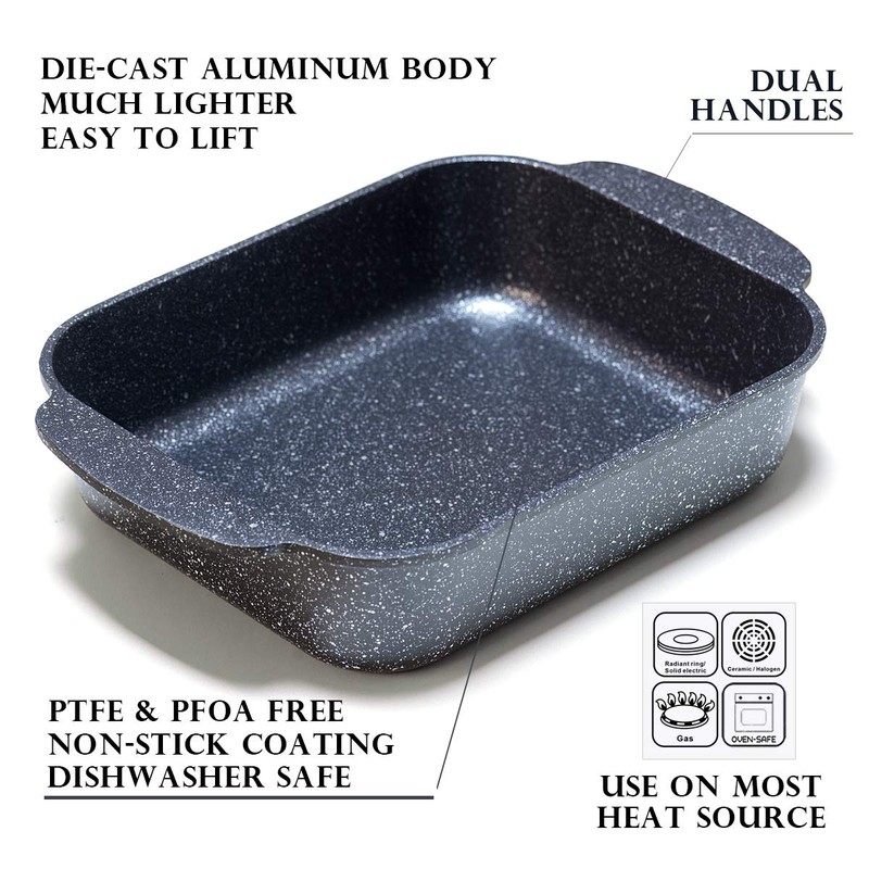 Crafted from the high-quality die-cast aluminum roasting pan is perfect for mid-week roasts, lightweight and features a non-stick coating to make sure your dishes come out just the way they should be, everything comes out of the pan intact, and makes it easy to clean when you’re done. Our die-cast aluminum roasting pan is dishwasher safe for low maintenance and added convenience and will be sure to become an everyday essential, this non-stick roasting tray is an essential, long-lasting convenience for every kitchen.