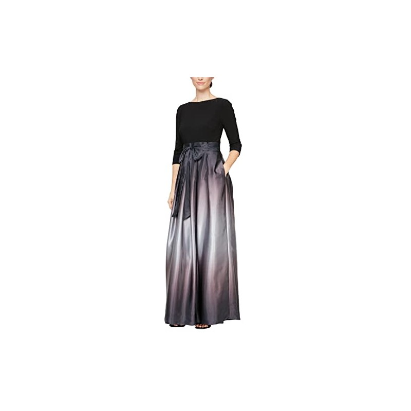 S.L. Fashions Women's Long Satin Mother of The Bride Dress with Pockets, Formal Party Gown (Petite and Regular Sizes), Black and Silver, 4P
