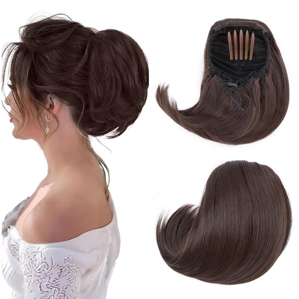 S-noilite Drawstring Hair Bun Ponytail Extensions,Short Ponytail Synthetic Comb Clip in Updo Hairpiece Fake Hair,12 inch Straight Hepburn Scrunchies Bun Hair Piece,Auburn Brown