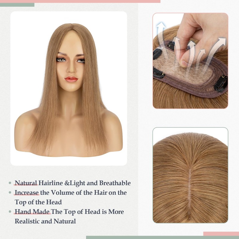 S-noilite Real Hair Topper Upgraded Silk Base Clip In Topper for Women Crown Light Brown Human Hair Topper for Thinning Hair 120% Density(12 Inch, Light Brown)
