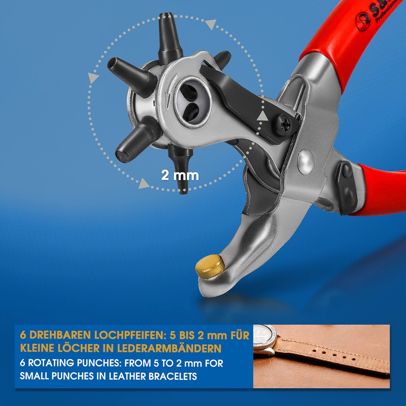 The S&R revolving punch pliers, "Made in Germany", is a high-quality, robust turning tool, ideal for precise punching or punching in leather, belts, bracelet watches, straps, cardboard, shoes and textiles. The leather hole punch pliers have 6 interchangeable hole pipes in sizes 2, 2.5, 3, 3.5, 4 and 5 mm, which allow for flexible, versatile application to materials. With a length of 24 cm and a weight of 282 g, it offers an ideal balance between comfort and stability. The ergonomic design ensures easy handling and comfortable working. The robust workmanship guarantees a long service life and reliable performance. The eyelet or belt hole pliers are suitable for hobby as well as professional work.